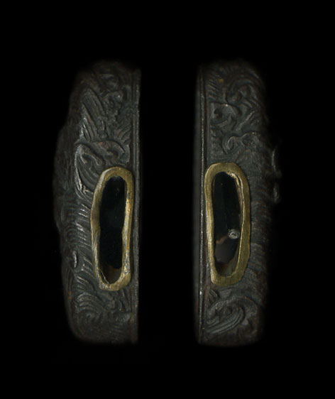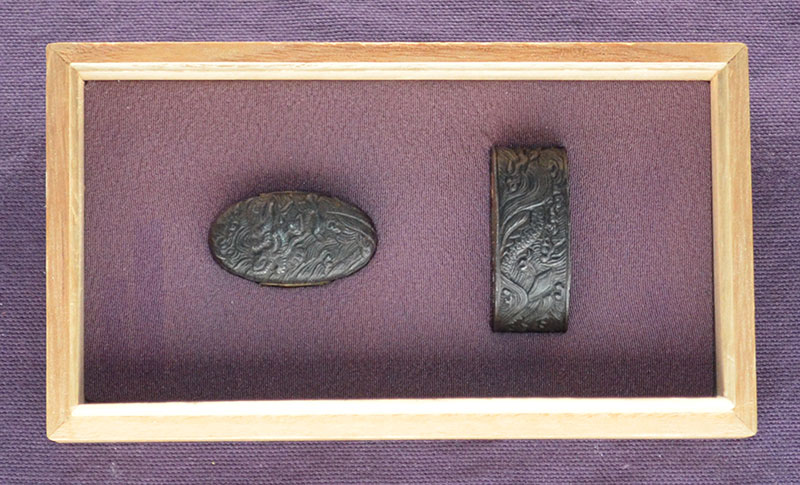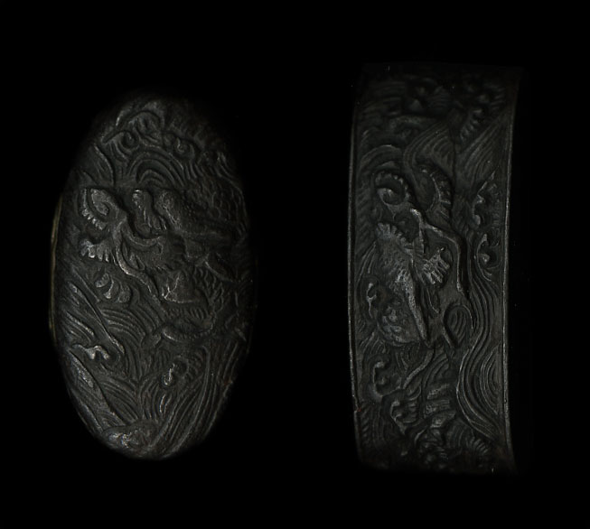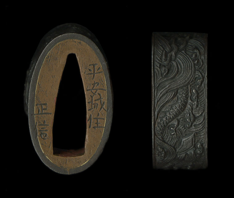 | Iron fuchi kashira with a well cut design of a dragon. Done in mild takabori, this dragon is done well. The signature of a Heianjo maker is very unusual and should be studied further. The set is large and is very nice for mounting. The dragon moving through the waves is a nice design and is easy to match for mounting. Unfortunately there is no listing in the Kinko Jiten for a Heianjo Masanobu. Fuchi kashira is accompanied with a custom fitted box. |