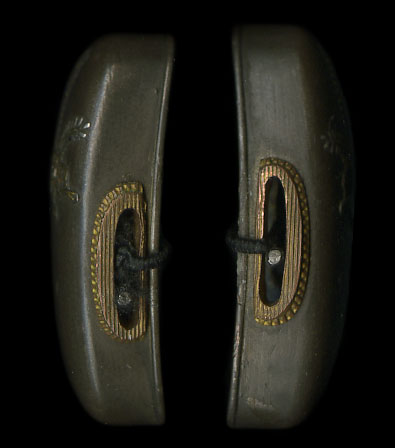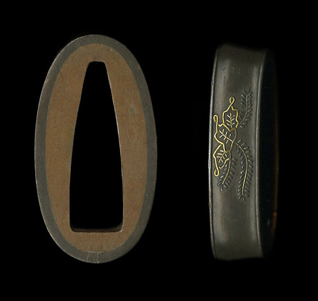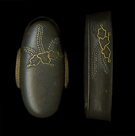 | Set of soft metal fuchi kashira with a design of the plant known as the Kiri. Done on a nice shibuichi ground, the detailed workmanship that is done for the main part of the design is made up of gold and silver and a small amount of suaka. Large sized and shaped for a katana, this set is done very well. The original shitodome are included as well. A very nice set for mounting. |
