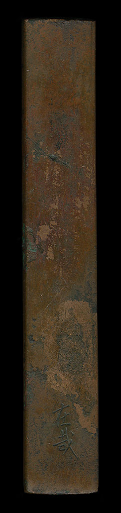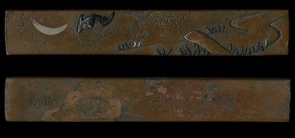 | Interesting copper kozuka with a design of the bat and the moon. This theme is very common in Japan, and is seen often on sword fittings. The base metal of this kozuka is copper, but the bat and some of the reeds are done in shakudo. The moon is done in silver. This kozuka is in a bit of a rough condition, so it may be suitable for mounting. |