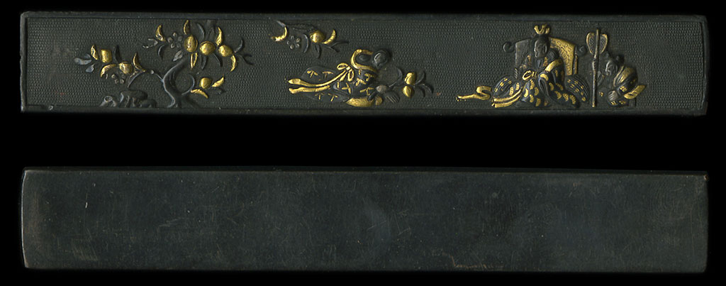 | A nice shakudo nanako kozuka depicting a peach tree and noble court scene of a peaches being presented. The peach has long been associated with longevity and immortality in Japanese folklore. Nicely carved with good use of gold highligths. Some small dings and slight wear, but otherwise in good condition. |