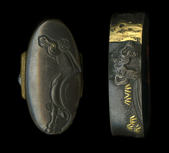 | Large shibuichi set of fuchi kashira with a design of a tree and a horse. The tree is done in takabori with gold added for contrast and detail. The Kashira is done in katakiribori and is well cut. The horse has 1 gold drop for the eye. |