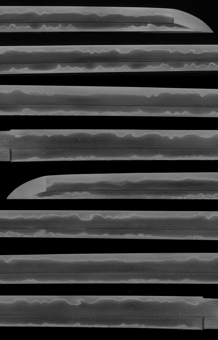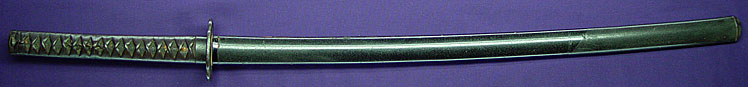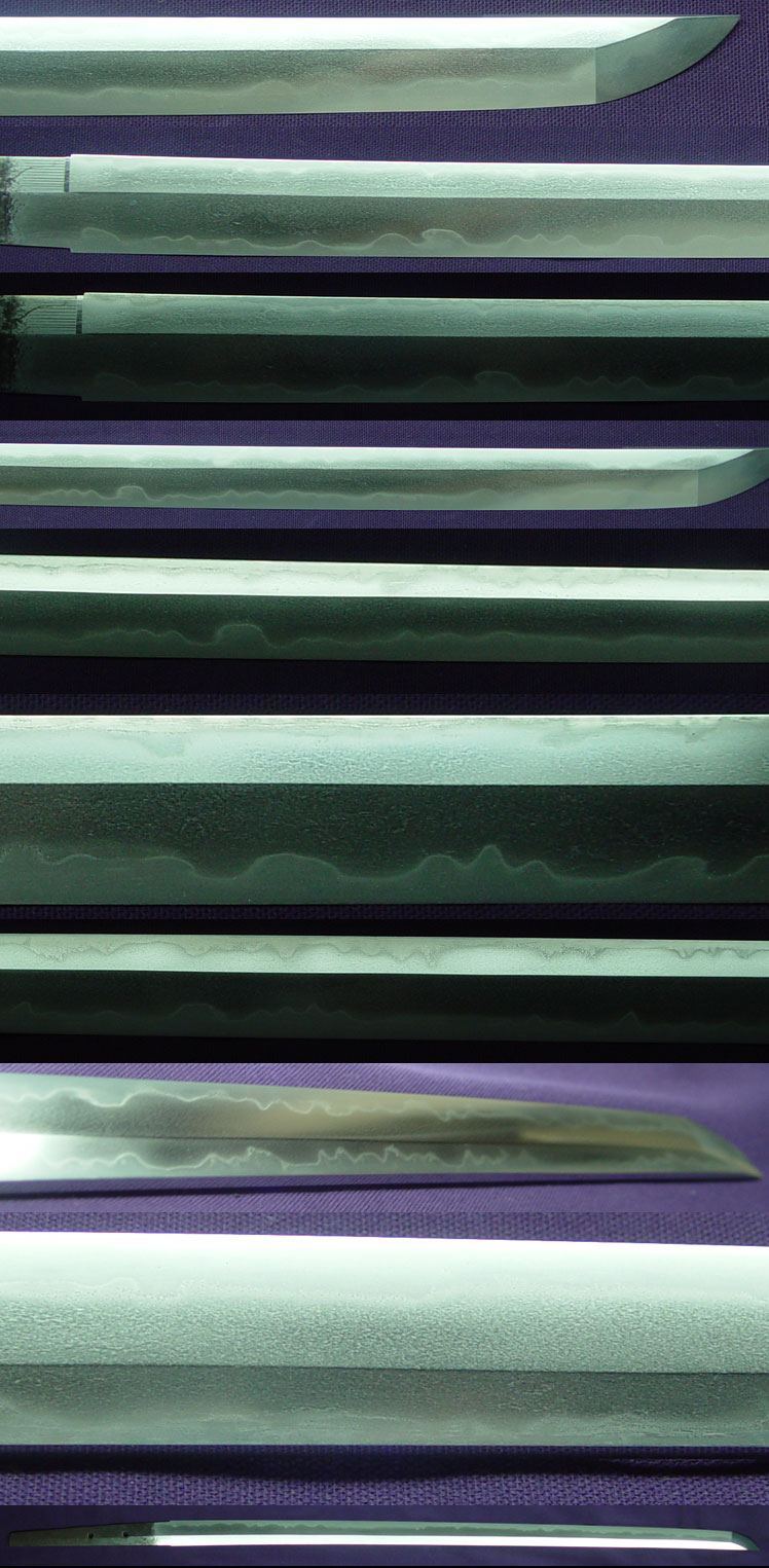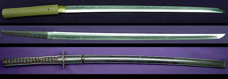 Shinto katana in full Edo-Period mount of good length measuring almost 28" was once even longer, now suriage partial-zaimei reading "Tajima Daijo Fujiwara Daido..." and cut-off. The two characters missing due to shortening should read "NAOFUSA". This strong, very healthy katana dates to the Kanei Era (ca.1624), and Naofusa was originally from Mino, where the name Daido originated from O-Kanemichi, but is said to have later resided in Tango Kuni. He was known to be a skilled carver of horimono. This blade is in good polish and exhibits the Mino tradition of the Shinto Period with a tight ko-itame hada containing ji-nie, while masame is very visible in the shinogi. The temper pattern is unusual in that not only is there hamon in the cutting edge, but there is temper running all the way back down the mune from the point. Hamon is a tight togari-style gunome midare mainly in nioi line but with larger nie crystals breaking up the tops of some gunome, and sunagashi effects. Boshi is a healthy and deep midare with nie, beautiful kissaki. Tang is 2-hole well-done suriage with partial signature remaining.