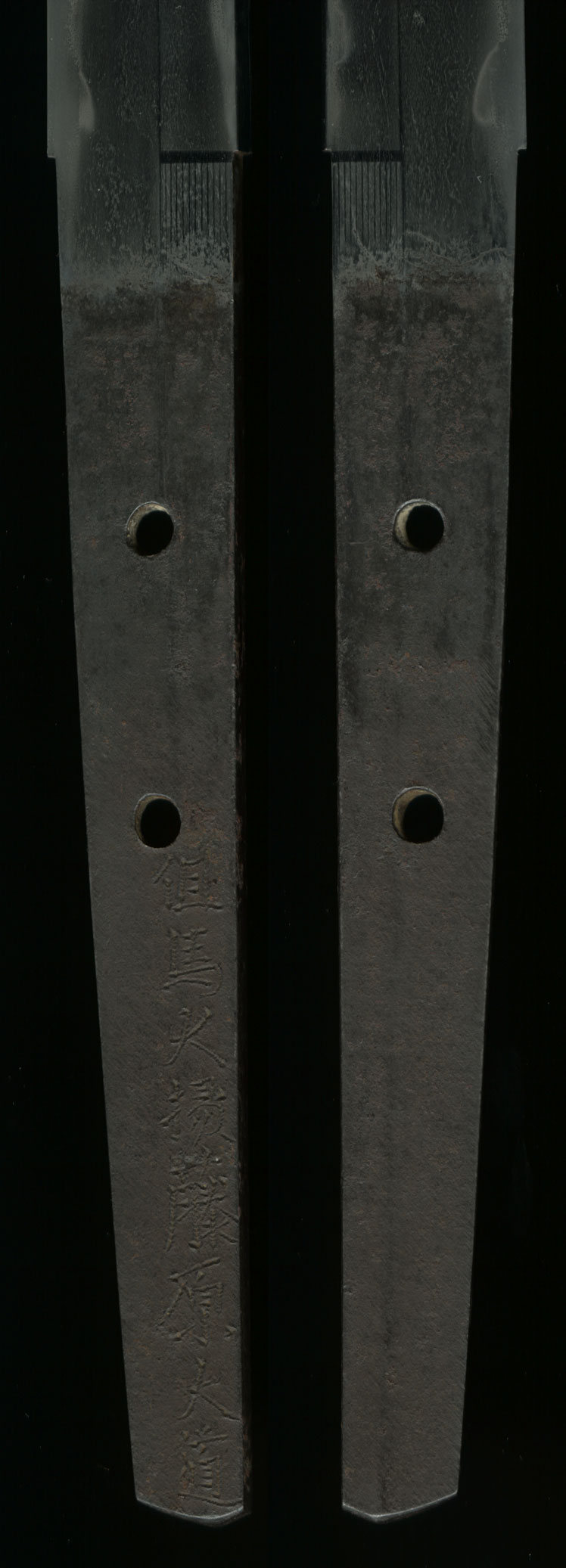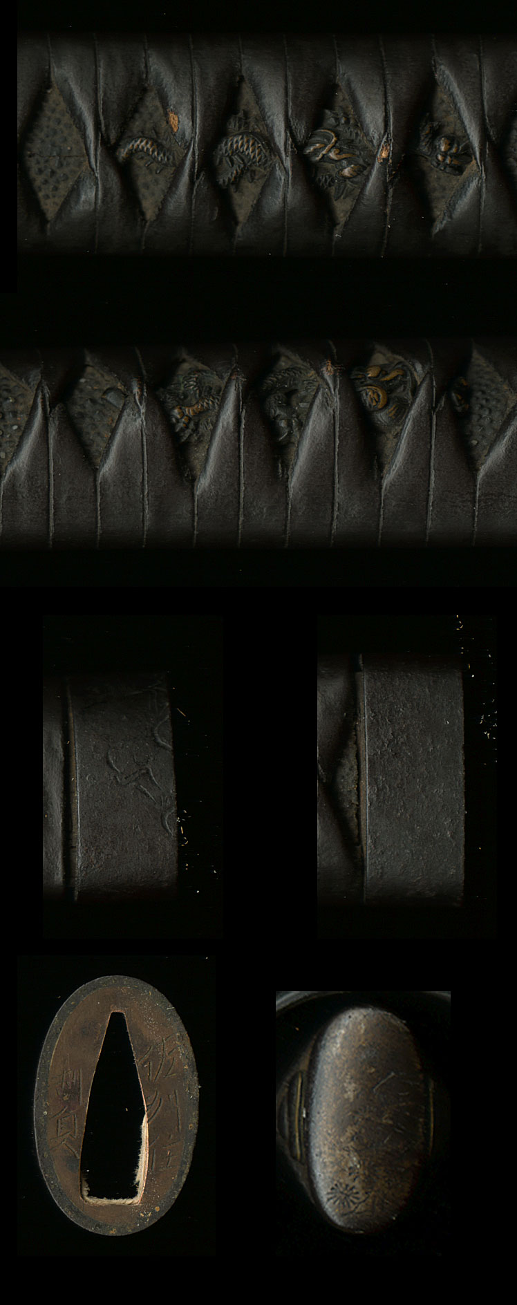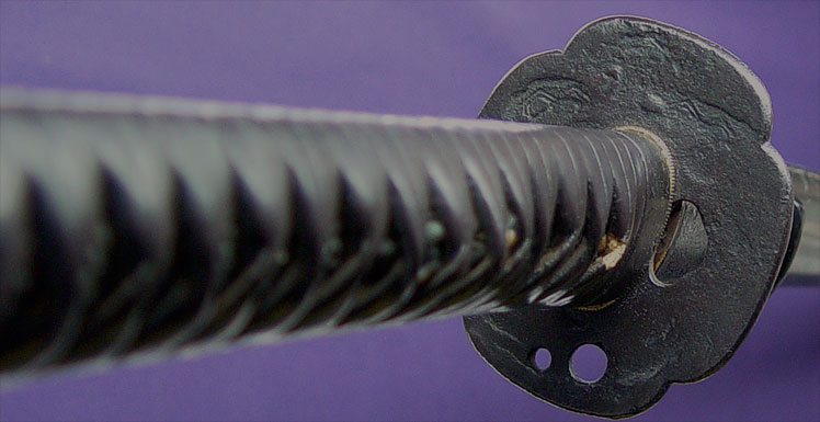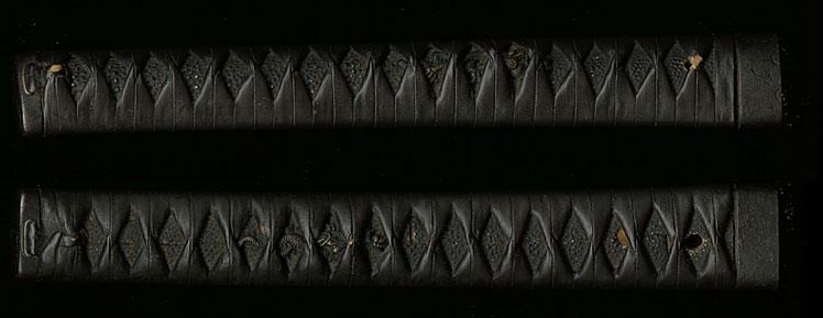 This sword comes in a complete period mounting with two-tone solid ishime saya, visibly split at the mouth and having small losses. Mostly intact leather wrap over black-lacquered same on the handle, with dragon menuki and a signed iron fuchi kashira with katakiri carving of Hotei. Tsuba is iron mokko shape with rounded-square rim and pierced with holes (udenake-ana). Saya is completely restorable. Signature guaranteed to pass NBTHK Hozon if sent through us