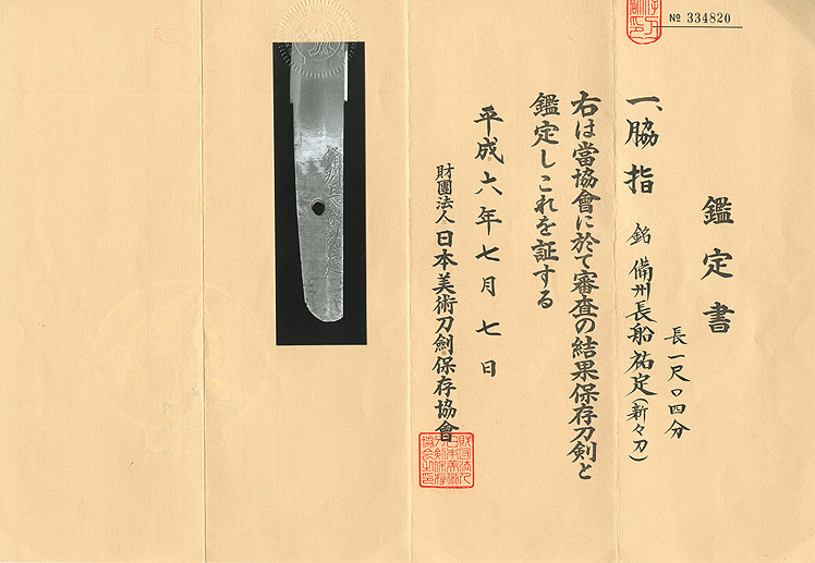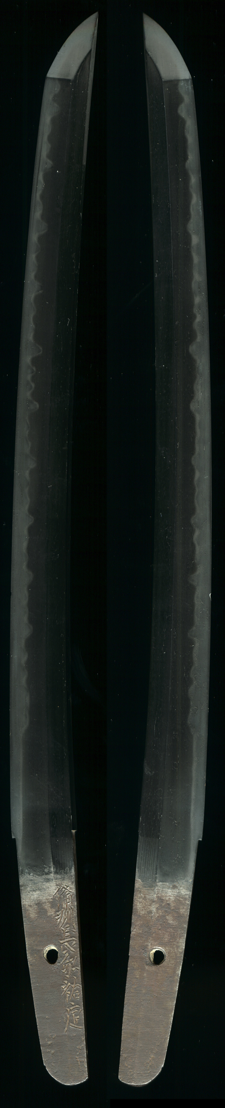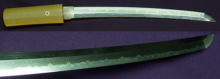 Very nice Wakizashi from the Shinshinto period. Bizen Sukesada, but a rare signed example of a line from the Shinshinto period. Many Sukesada are from the late Koto period, and many are mass produced. Sukesada from the Shinshinto period are rarely sen, and are often confused as older pieces. The Sukesada name during the Shinshinto period was used by either Sukehira or Sukenaga in some cases as their early signature. Because of the yakidashi in the hamon, we can definitely see the Yokoyama School connection. The hamon is a well defined gunome midare, with ashi ko nie deki. The hada is a mix of ko itame with mokume. There is a very small nick on the edge, but otherwise the blade is in very nice condition. A very nice silver habaki with a Japanese made shirasaya complete the package. |