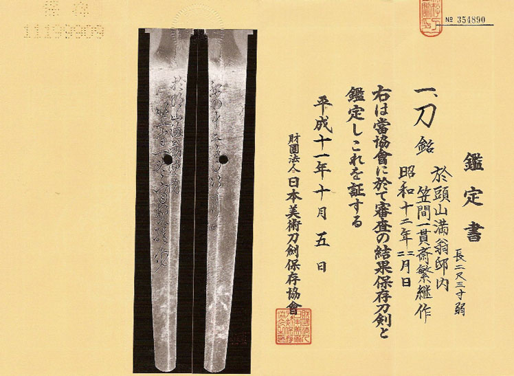 Rare chance to own an outstanding sword made by one of the best that worked during the 1900’s. Kasama Ikkansai Shigetsugu was born, Kasama Yoshikazu on April 1, 1886 in Shizuoka. He studied sword making under his uncle, Miyaguchi Ikkansai Shigeyoshi until 1903 when he went to Tokyo and studied under Morioka Masayoshi. Shigetsugu was the master swordsmith at the Nihonto Tenran Denshusho. He is often associated with the infamous Black Dragon Society as he was hand picked by the head of the society Toyama Mitsuru to make blades on his estate that were usually given to important people in the government, military or industry. Toyama Mitsuru was a most powerful individual, so he could have had any swordsmith to do work for him, but he chose one of the best, Shigetsugu to work for him personally.