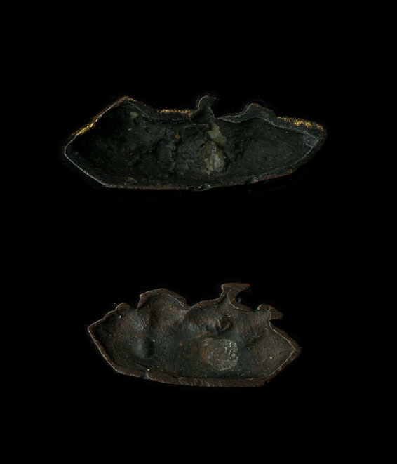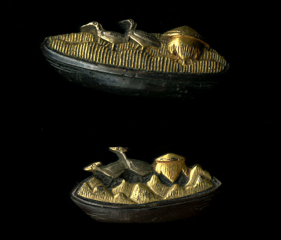 This is a nicely carved set of menuki with a design of a boat and birds. Nicely carved, this set is made up of shakudo, gold and silver. This would be a nice set for mounting.