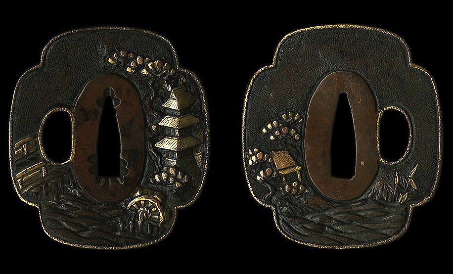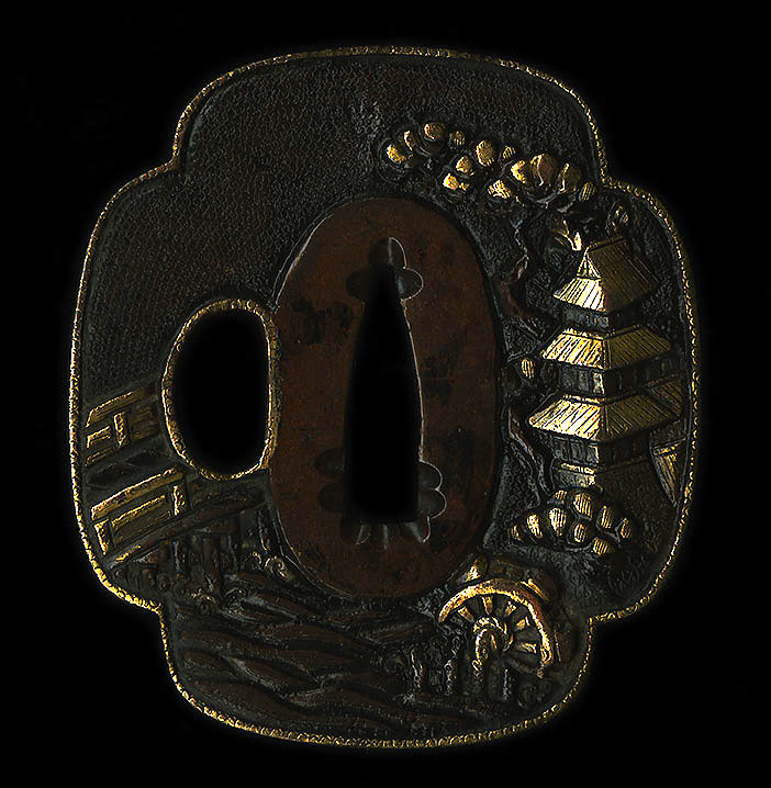 A nice mokko shaped tsuba with a pagoda scene on nanako background done high relief. This tsuba depicts a scene including a river or stream with pagoda with a pine tree and mill waterwheel and a bridge. Nice use of gold highlights.