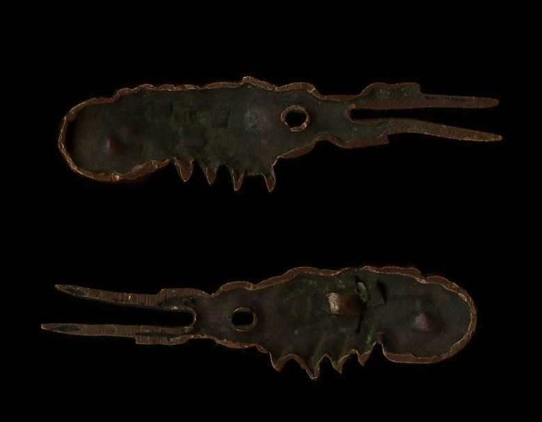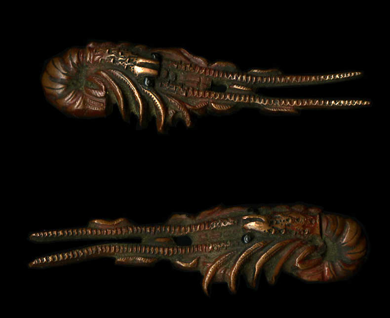 Nice large red copper menuki with a design of a lobster. The lobsters are well carved with the eyes done in shakudo.