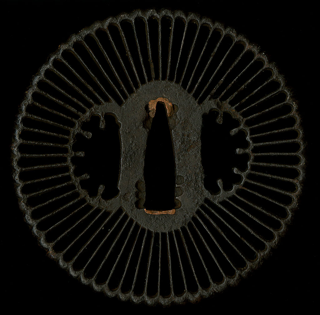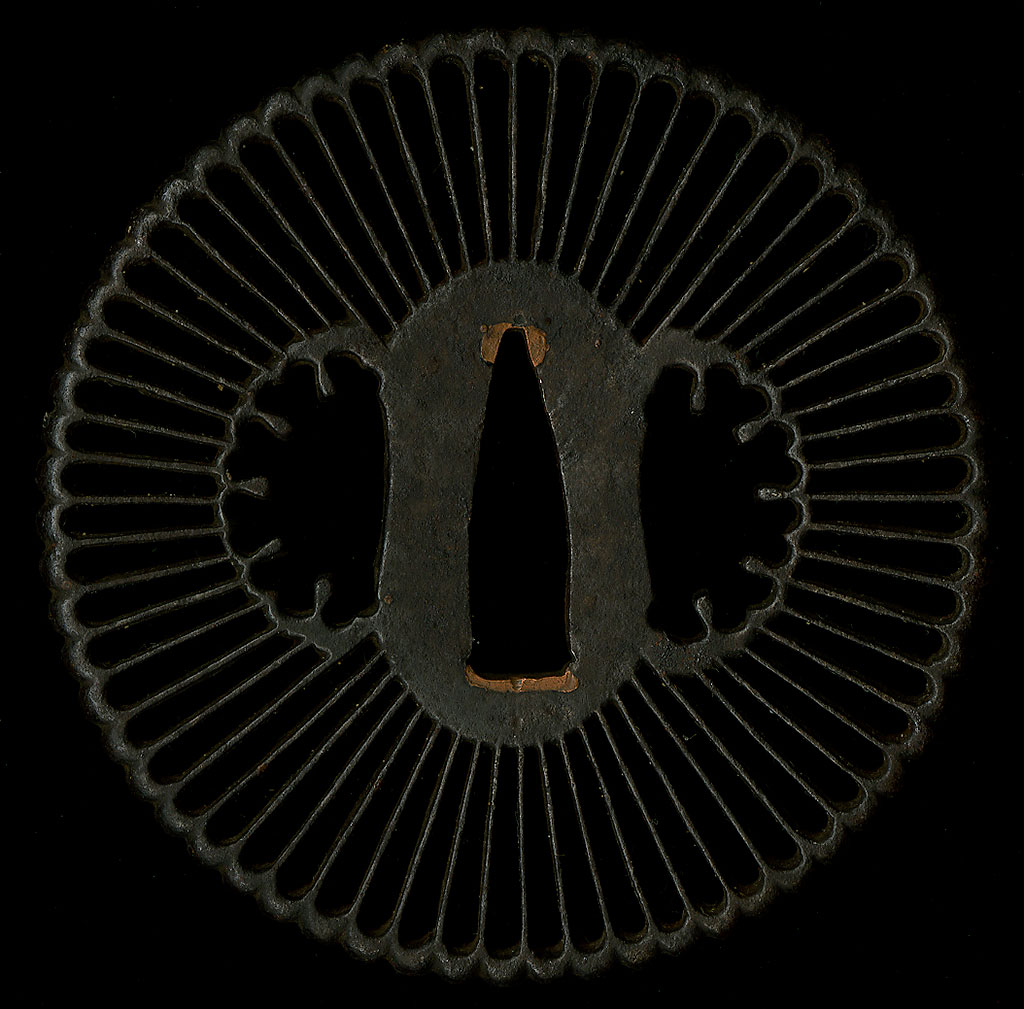 | A very nice large iron tsuba from the Saotome school with a good patina. The Saotome school were known for doing very nice sukashi work in the kiku or chrysanthemum style. These type of tsuba were made from the Koto period until the early to mid Edo period. Very fine thin carving done for the chrysanthemum spokes shows the time and care involved in making tsuba of this type. Because of the quality and design of this tsuba, they were easily appreciated on their own or mounted on as sword. The iron used is of good quality, and the piercing work on this piece is well done. In very good condition for its age. |