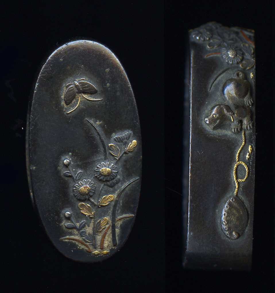 Set of shakudo fuchi kashira that has a very cute theme of a puppy dog playing with a butterfly. The