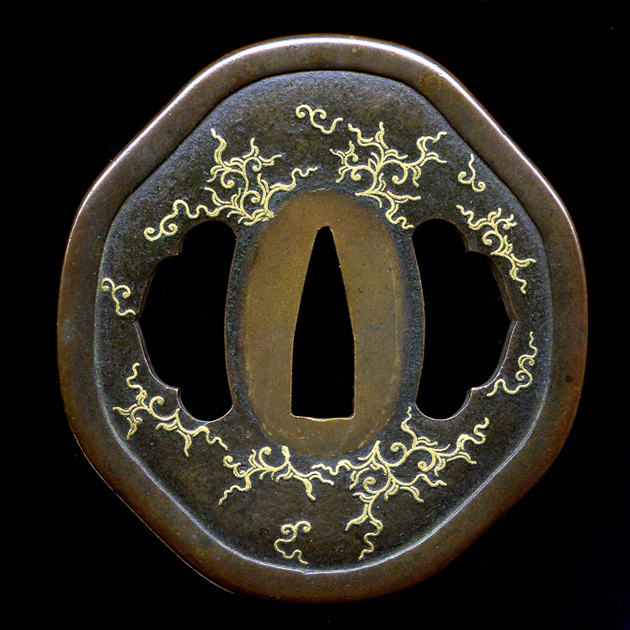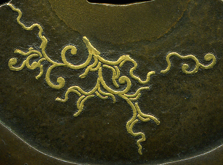 OK lets see who is paying attention! Available for a limited time only,tsuba made by the famous Higo artisan Nishigaki Kanshiro. Kanshiro is one of the most famous higo kinko artists, and there are many examples of his that are Juyo. Even rarer are the type of tsuba that are made of soft metal such as this example. This tsuba is made primarily of shinchu (reworked high grade brass), but with the masterful patina it almost appears to be made of copper. Kanshiro like his teacher Hikozo, were masters at working with metals such as brass, copper and shibuichi. They had the extraordinary talent to be able to make such metals look and appear any way they wanted. Kanshiro along with Hikozo and Jingo worked mainly for the Hosokawa family. They made tsuba for the Hosokawa and the main retainers. This tsuba which is offered today is in absolutely perfect condition, papered to the master Nishigaki Kanshiro. Many pieces are only attributed to the school and only say Nishigaki on the paper. I have been asked by many people to put such level of tsuba on the site (usually this type of tsuba I don’t put up openly, but John had asked for some real good tsuba for the site.) So for the masses, here is your chance, a perfect condition large sized tsuba ALREADY certified to Kanshiro, soft metal with ALL the gold inlay intact, with perfect patina. Need I write any more? Offered for 1 month only! |
