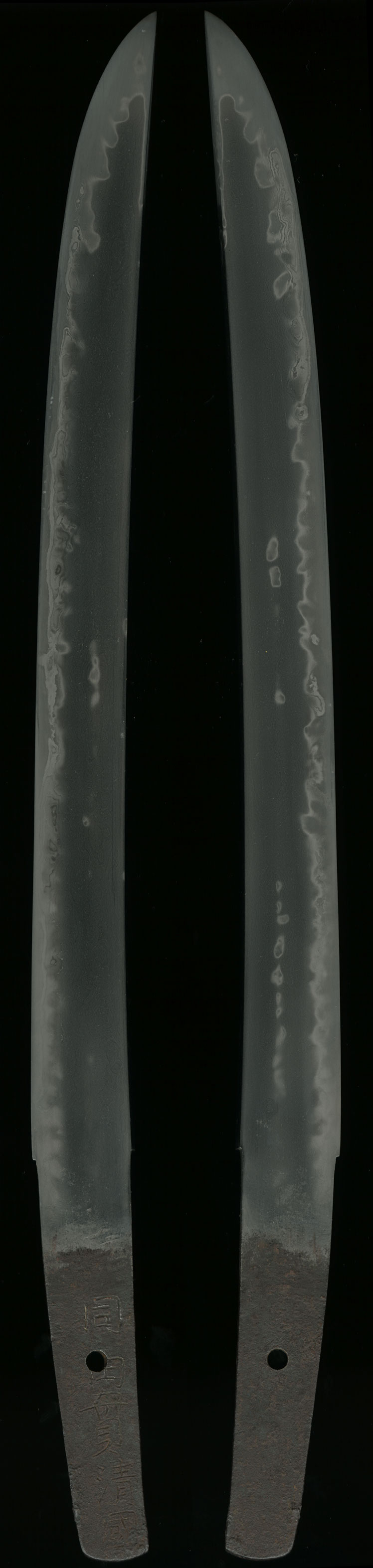 This is a very good sunnobi tanto with mounting from Kyushu made at the very, very end of the Koto period on consignment. The flawless blade is an ubu, unaltered 1-hole zaimei Koto signed "Dotanuki Kiyokuni", hira-zukuri with a slight sori; tang ends in a squarish kuri-jiri and is clearly signed, with appropriate age. Blade is polished. Very clear, tight itame-nagare with prominent minute chikei everywhere was produced by mixing steels. Combined with a very active and irregular hamon of mainly gunome-midare including floating islands of temper in parts of the ji and even some muneyaki, the imozuru or "potato vine" type of dark kinsuji wiggling randomly through the hamon indicate uniquely Satsuma work. The Dotanuki group emerged in the Momoyama Period as descendants of the Enju smiths, serving Hideyoshi and, more specifically, Kato Kiyomasa. One source suggests that Kiyokuni and others got use of the "Kiyo" in their name from servitude to Kiyomasa. Kiyokuni is also said to have eventually resided and made swords in neighboring Satsuma; this blade seems to confirm such information. The Dotanuki group is another name associated with extraordinarily keen swords. This blade came with a mounting in need of restoration; hamidashi-type matching copper tsuba, fuchi, koiguchi, and kojiri scrolled with vines and mon. Black lacquer ishime saya needs repair and is missing the kogai strip and kurikata. Solid string wrapped handle is missing one tomoe menuki and the kashira; the kashira can be replaced with black horn. The whole mount is very restorable. Blade comes in shirasaya with old copper habaki. |