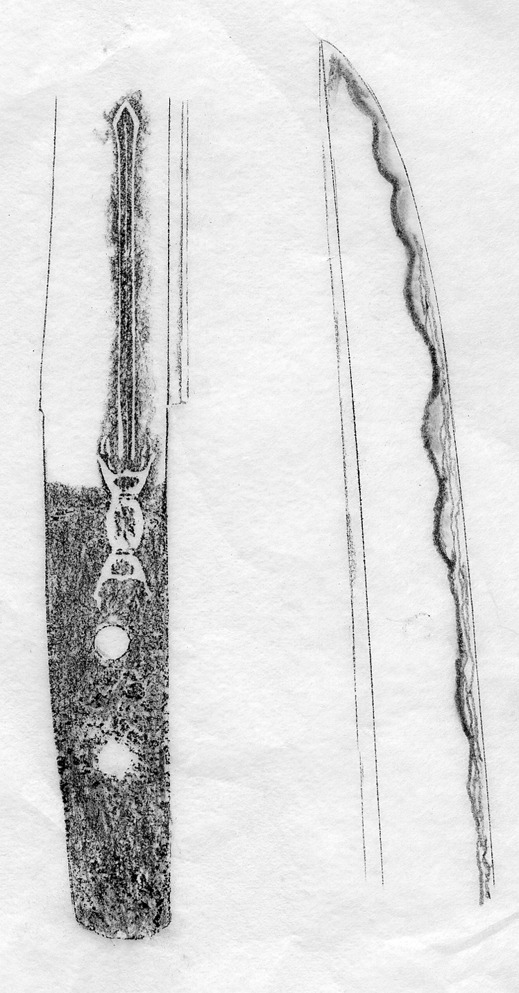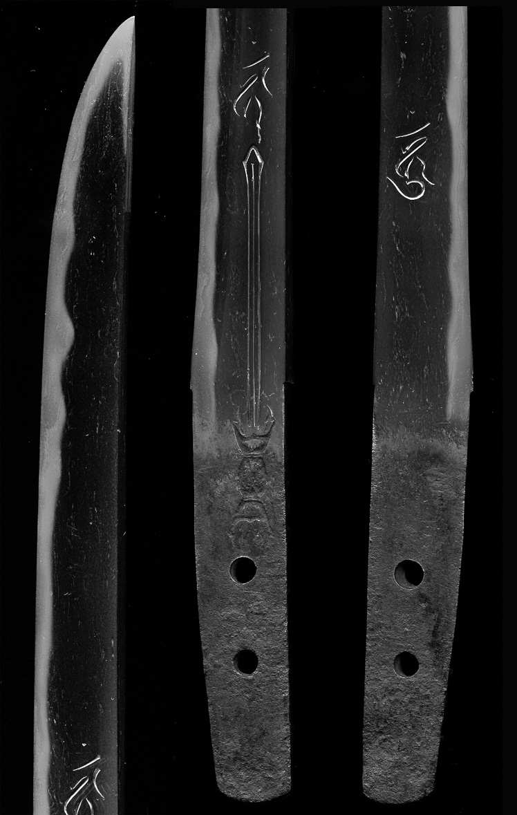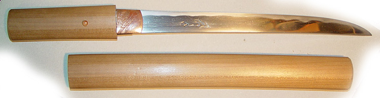Nice tanto done in Soshu style from the Koto period. Hirazukuri in shape, this is a very nice example of Soshu style hamon and activity. Hamon is a nie deki notare with a very thick nioiguchi in places. Usually blades with a thick nioiguchi are of high quality. Long kinsuji run the length of the blade, sometimes in pairs. The nie is very fine and well done. The jigane is a mix of O Itame and masame. There is also a carving of a Ken and Bonji on one side, with 1 Bonji on the reverse. The blade has been shortened and from the tang one can see the handle of the ken horimono showing that it is original and old carving. The mune is mitsumune (3 sided) also like those of the Soshu den. A red copper old habaki and shirasaya accompany the piece. |
