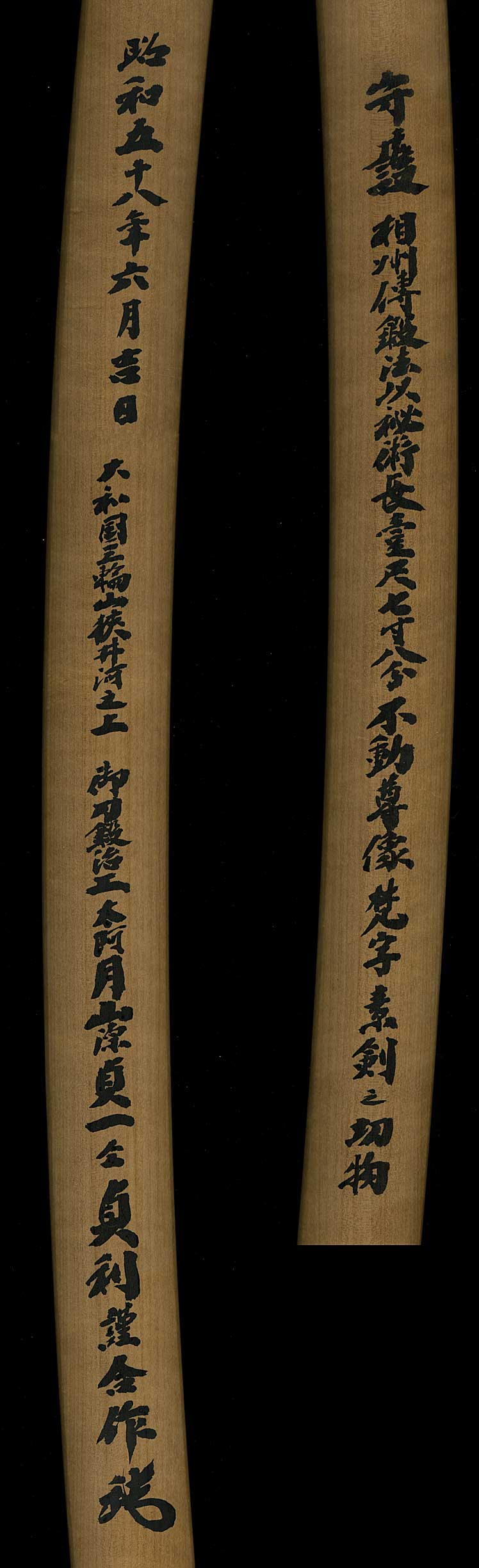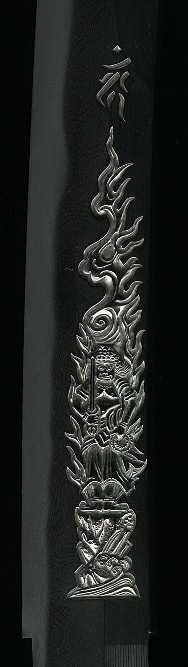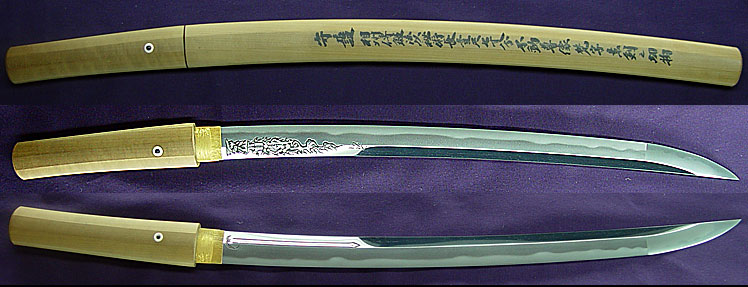 This blade is really spectacular, done in the Soshu style of swordmaking. The wide body with the extended Okissaki matches well the Soshu den hamon. The blade shape is known as “Kanmuri otoshi” which is the style in which the shinogi is beveled in like a Naginata zukuri. The hamon is made up of very fine bright nie done in a gunome notare midare. Ashi, yo and fine kinsuji appear in the hamon. The grain pattern is outstanding as well, done in a ayasugi mokume mix, this hada is fantastic to look at! Chikei and fine ji nie appear all throughout the ji. One can easily tell that this is a masterpiece work by the 2 smiths. And, as if that was not enough, the carving is excellent done by one of the best carvers of the time. One side has the God of War Fudo Myoo deeply carved very expertly showing great skill and strength, and on the obverse is a very traditional suken done in kebori. In top Japanese polish (Living National Treasure blades usually are only polished by the best polishers). A sword of this quality rivals many of that done by older famous smiths and are hardly ever offered to the public for sale. In a top level shirasaya with a rare sayagaki by Sadaichi’s own hand stating that this blade was jointly made with his son, in a special method that is a secret Soshu tradition. This blade was made around 12 years after he received his title of Living National Treasure. |