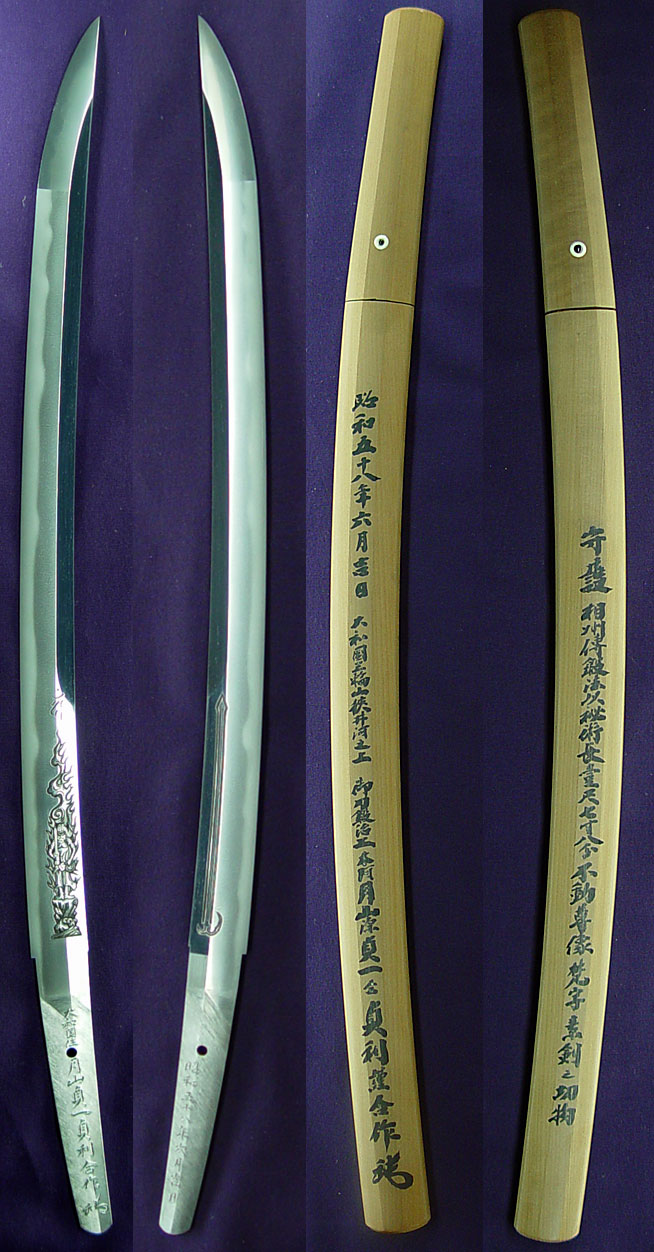 A very rare and outstanding blade offered for sale. Gassan Sadaichi is the son of the famous Gassan Sadakatsu, who was the son of the most famous Gassan Sadakazu. Sadaichi took the name of his grandfather, and continued his fame by becoming a living national treasure. His skill, in both swordmaking as well as carving shows well in this blade. What makes this particular blade interesting and rare as well is the fact that it was jointly made with his son Gassan Sadatoshi. Swords by Living National treasure smiths are rarely offered for sale, and most people are not aware of their true inherit value. Sadaichi’s blades are actually very rare, as he did not make many blades after he received his top title. He devoted his time to making his blades very special and of top quality. He was born on November 8, 1907, and passed away on April 1, 1995. He received his title as the 2nd generation Sadaichi (Sadakazu) on 1966, and then was awarded the highest title possible of Juyo Mukei Bunkazai (Living National Treasure) in 1971.