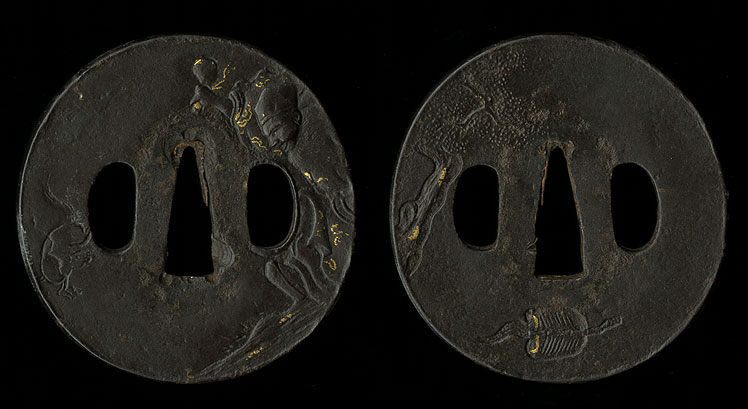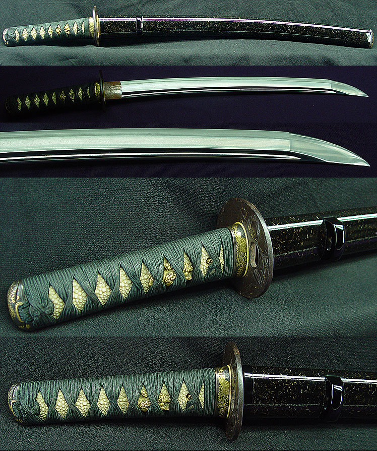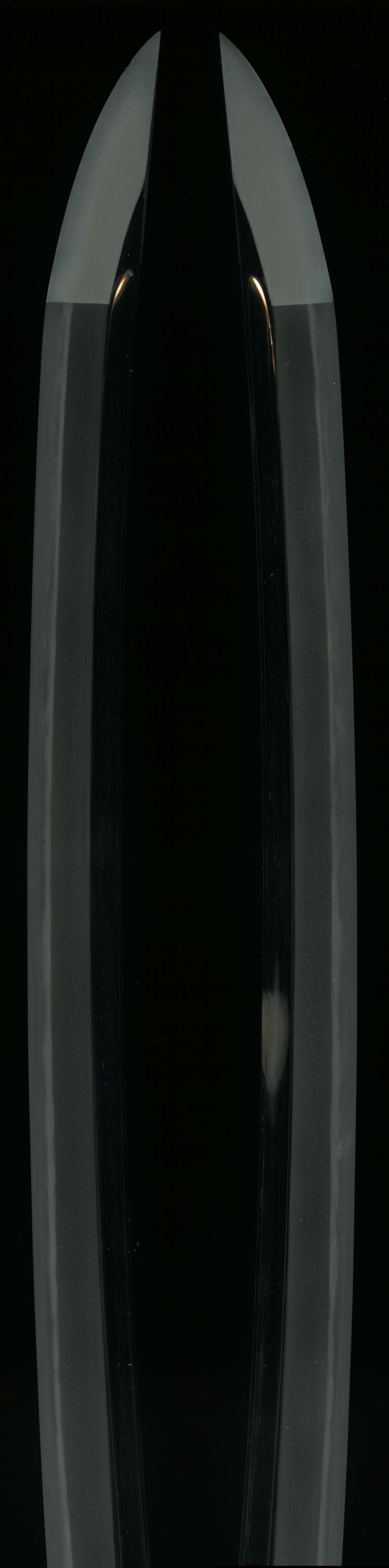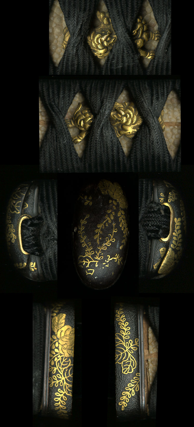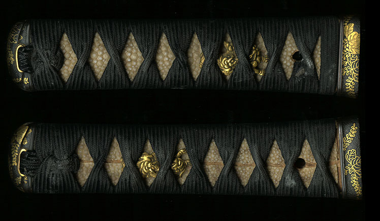 This sword is in an excellent mount with handle in very good condition and lacquer fully restored. Older tsuka has large-nodule same wrapped with black ito with fine gold shishi menuki. Fuchi-kashira are fine iron with gold kiri vines inlaid, possibly Edo-Higo work. Tsuba is iron and unsigned with two hitsuana showing Chokwaro conjuring his horse from within a gourd, a tree and fan on the reverse. Saya is dark brownish patterned lacquer sprinkled with small filaments, trimmed with horn fittings and a kojiri en suite with the handle. Seppa are gold foiled and habaki is copper in fine condition. This sword is completely restored in excellent shape.