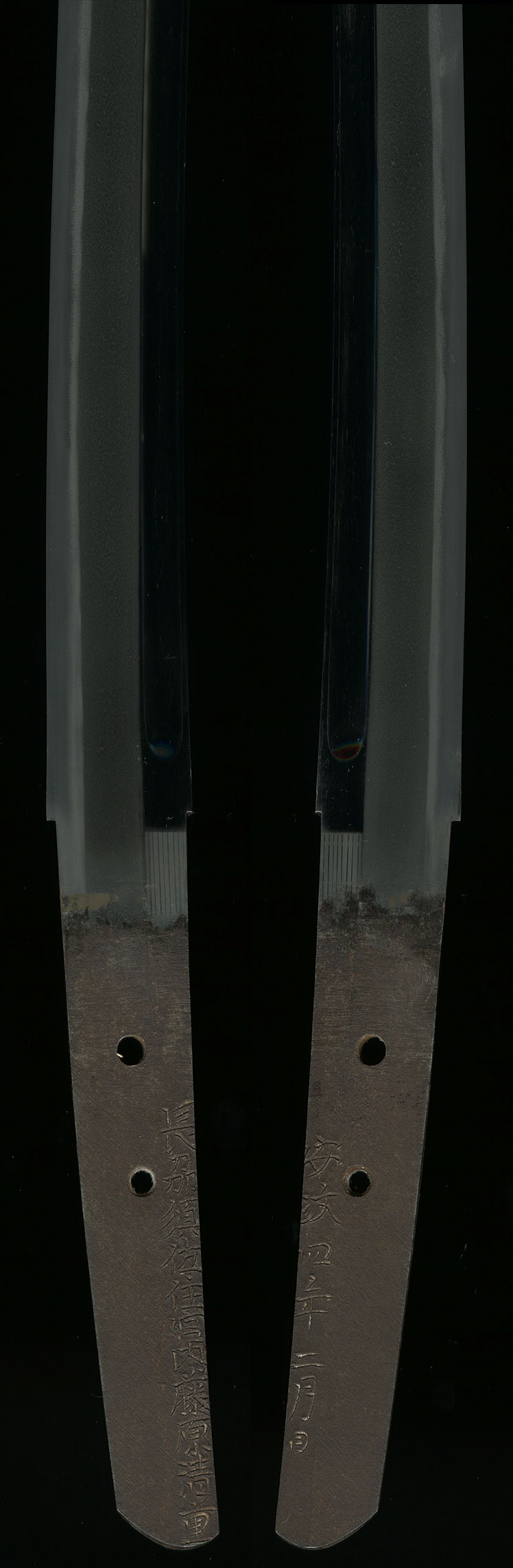 This is a fine Shinshinto wakizashi in perfect polish and no flaws on consignment, signed and dated, with a very nice koshirae in excellent condition. Blade is ubu, though probably machi-raised, with 2 holes and nagamei (longish signature), dated on the reverse. Torii-sori with little reduction in width ends in an O-kissaki (extended point). Very fine, tight ko-itame is combined with a ko-nie deki suguha with some notare; there are gleaming bo-hi (rounded-end grooves) on each side, well shaped. this is an impressive sword in the hand. Choshu ju Fujiwara Kiyoshige is a name signed by several generations since Shinto times; this particular one is one of the last, being dated Feb 1857. The inclusion of the smith's family name is valuable data.