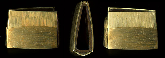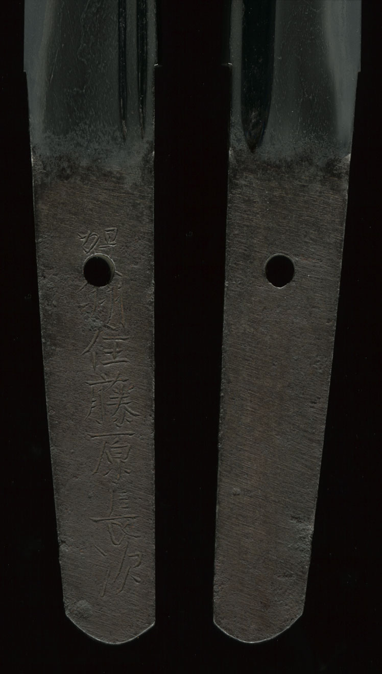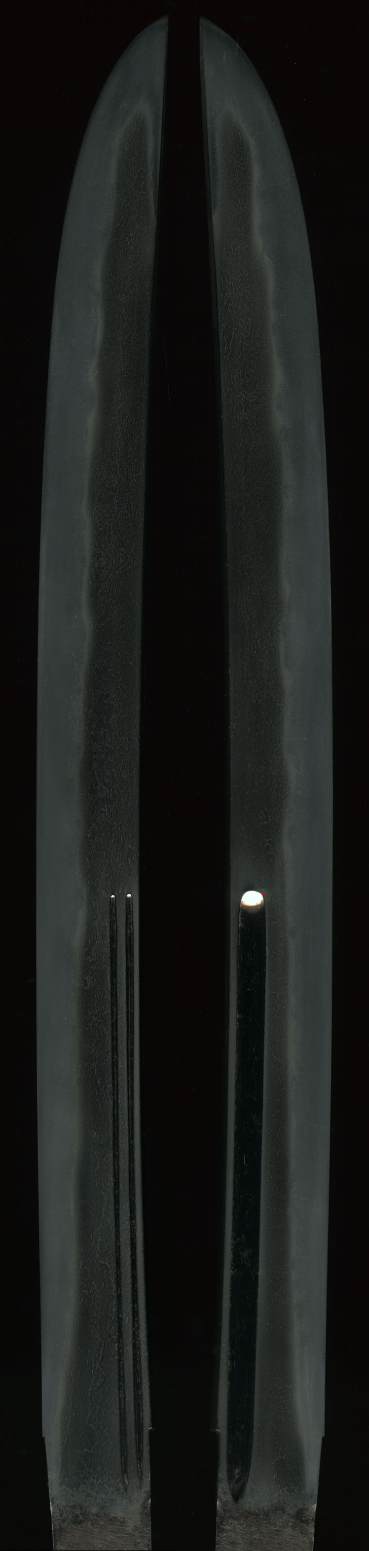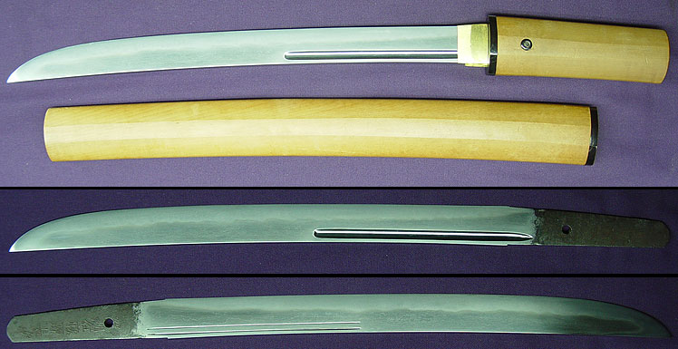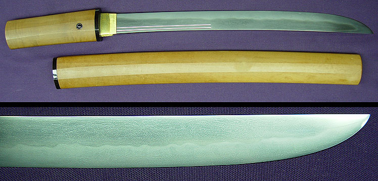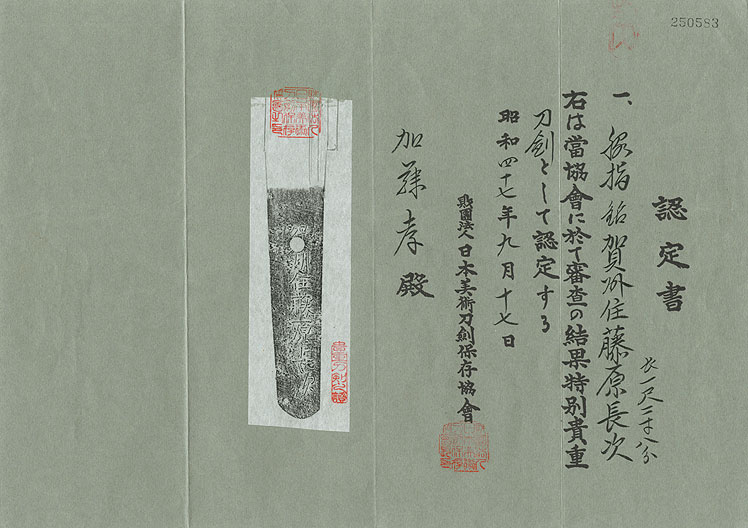 | A rare wakizashi in Soshu style made by the Kaga smith Nagatsugu in the mid 1600's on consignment. This thick, wide short sword is extremely healthy with no flaws, unaltered and original ubu 1-hole zaimei reading "Kashu ju Fujiwara Nagatsugu". Heavy broad hira-zukuri shape with slight sakizori ends in a full point and boshi; a shin-no-mune (mitsu-mune) suggests elevated status. There are conservative gomabashi hi and a koshi-hi (grooves) tastefully decorating either side. Swirling itame hada with some O-itame has ji-nie and chikei; midare hamon with gunome in nie-deki has some spirited activity, widening towards the point with a long turnback. Soshu style in the early Shinto tradition; Nagatsugu is an obscure smith listed in Fujishiro working in Kaga province in the mid 1600's. Kaga along with neighboring Echizen was noted for conspicuous sword production in the Shinto Period representing the Northern districts. Notable Kaga smiths include Kashu Kanewaka, Fujishima Tomoshige, Darani Katsukuni, Kaga-Aoe and Fujishima lineages in Shinto times. This sword is in full older polish with no flaws and comes in a fine older shirasaya with black horn trim and a fine gold-foiled niju habaki. The NBTHK Tokubetsu Kicho "green" certificate is dated Showa 47. |