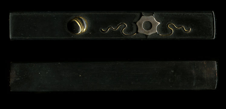 | Very old kozuka that is most likely either Ko Goto or at the very least Ko Kinko. But the use of uttori (gold foil) for the design seems to point to the Goto School during the Muromachi period. Jet black shakudo, with the use of gold and silver for the design shows great care in manufacture when looked at carefully. Old pieces such as this have a certain charm to them, and this piece is no exception. We believe the subject to be that of old toys, but can also be that of sewing items. As one can see the shakudo nanako background has been worn down, but yet the dark black shakudo color remains. That is because top grade shakudo will re-patina itself, unlike those of lesser quality used in inferior pieces. |