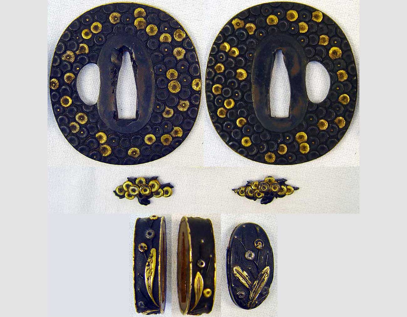 with design of mass chrysanthemums in gold and shakudo. Design is