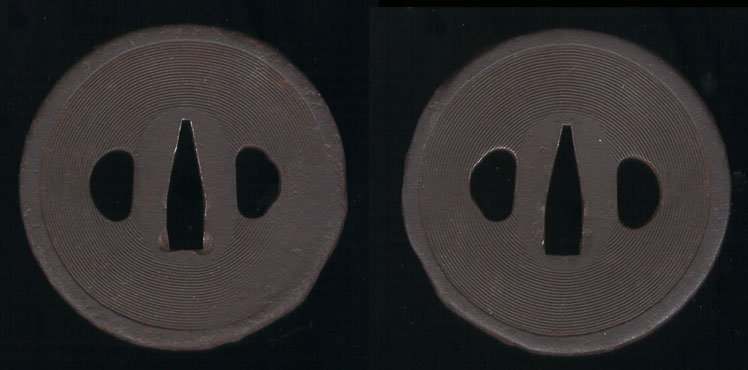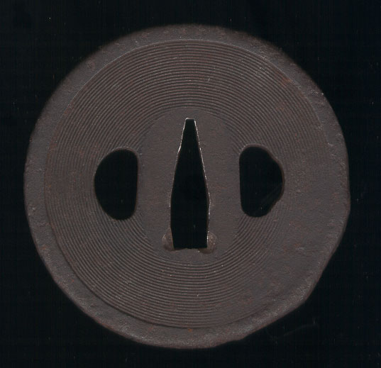 Large Shoami School tsuba with design of concentric circles finely carved on the surface. Tsuba has nice patina, but has some wear on the rim on one side. Otherwise in good condition.