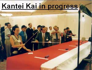 NBTHK Kantei Kai 2001 Here are the swords that were used by the NBTHK convention in Kobe this year. All of the blades were of very excellent condition as well as quality examples of each smiths work. The object of a “Kantei Kai” is to be able to reach the answer of who made the sword through various degrees of deduction. The tang of each sword is covered, giving one only the upper portion of the sword to view. By analyzing the characteristics of the blade, one must judge correctly the time period, school, and hopefully eventually the name of the smith that made this sword. Looking and noticing key points in conjunction with the basics, it is possible to achieve the correct answer. Characteristics that are important usually include type of hada, hamon type, boshi, shape as well as type of hataraki (kinsuji, utsuri, etc…) The following with special permission is an excellent translation from the European branch of the NBTHK of the article from the NBTHK monthly magazine “Token Bijustu”. Also included is the article from the magazine itself.