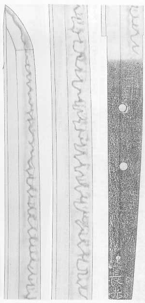 The blade has a little wide mi-haba, koshi-zori (even after suriage) and proper sori in the monouchi area so that it is attributed to one of the mid or late Kamakura period. Taking into account the clear midare-utsuri, it can be narrowed down to Bizen smiths. Among them, smiths who produce such clear midare-utsuri are the ones of the Ichimonji school, Mitsutada and Nagamitsu of the Ko-osafune school and Moriie of the Hatakeda school. Taking a close look at the hamon, it is tempered in irregular width and mixes many gunome then the pattern becomes calm in the monouchi area. Thus, the Ichimonji school is excluded then Mitsutada, Nagamitsu and Moriie become smiths whom you have to give consideration. All of them demonstrate a similar workmanship. Moriie tempers many and kawazuko-choji and his utsuri forms a pattern of kawazuko-choji too. Mitsutada’s extant works with signature have a resemblance to this tachi but choji is more emphasized and few togari-ba are seen in his hamon. Also his work could be mistake for Yamashiro swords at a glace since considerable nie are seen inside the hamon. It is very rare to see hamon of Nagamitsu based on choji and kawazuko-choji. He normally tempers choji with round head and it mixes gunome and togari-ba then continuous gunome is tempered in small pattern in the monouchi area. His boshi becomes midare-komi with ko-maru or pointed tip when he tempers gorgeous hamon. Yoshifusa and Sukezane of the Fukuoka-ichimonji school forge visible jihada and they temper choji mixed with o-choji and fukuro-choji in irregular width. Sukezane makes grand tachi-sugata and tempers the most gorgeous hamon in the school. The Yoshioka-ichimonji school tempers choji and the pattern tends to be slant on the whole. Kagemitsu and Chikakage of the Ko-osafune school hardly temper gorgeous choji-midare. Their hamon are based on gunome then mix squarish gunome and kata-ochi-gunome then the pattern tends to be slant on the whole and many ashi are seen inside the hamon. Kagemitsu’s boshi is gentle notare with ko-maru, which is so-called ‘sansaku-boshi’. Chikakage’s jihada stands out and his boshi goes straight across the yokote line then becomes gentle notare and turns back in circle. |