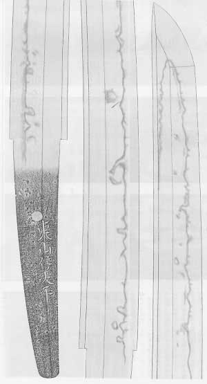 It is very rare to see Higashiyama Yoshihira in kantei and there are few smiths that are given ‘Dozen’. Therefore only a few persons were successful in kantei for this sword. His real name is Umetada Denzaburo and it had been believed that he was a student of Umetada Myoju and died in the 8th year of the Kan-ei Era at 74. Today, this theory is doubtful since there are his extant works with the date of the Kan-ei and Enpo Eras. It is speculated that he learnt sword forging from Shigeyoshi who is an adopted son of Umetada Myoju. It is said that he used smith names of ‘Oe Yoshitake’, ‘Higashiyama Sosetsu’ and Oe Takamitsu’ in his last years though his extant work with Oe Takamitsu has not been confirmed yet. Yoshihira tempers unique o-gunome-midare in oblique pattern that the Hon-ami family called it ‘Kata-yahazu-midare’ then this midare is a decisive factor to attribute to Yoshihira. In addition, Yoshihira tempers wide and deep boshi with long kaeri as shown in this blade. This boshi has very long kaeri so that votes were dispersed to the Uda school, Fuyuhiro, Kaga, the Sue-soshu, Sue-bizen, Sue-seki and Shimada schools. Also there were a certain number of votes for Oya Kunisada, 2nd and 3rd Yasutsugu. Yoshihira signs in the semi – stylized style of writing Chinese characters and yasuri-mei starts from the lower part of the nakago in katte-sagari at obtuse angle. Two swords by Yoshihira have ever been designated as Juyo Token. |
