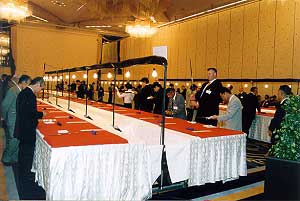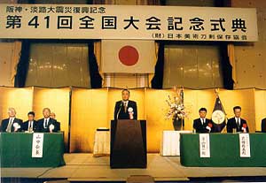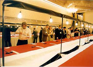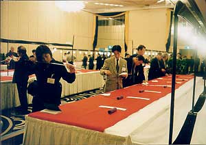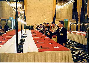 Sept 8-9 2001. Around 600 people attended the National Sword convention held by the NBTHK at the ShinKobe Oriental Hotel. In celebration for the "rebirth" of Kobe , the Japanese city that was severely damaged in a major earthquake in 1995. This was the 41st convention held by the NBTHK, and as usual it was a great success. Many excellent swords were on display with a very rare opportunity to be able to have a "hands on" chance for study. Most of the swords that were on display ranged from Juyo-Token up to Juyo Bunkazai. To provide a better understanding of Japanese swords, there was an example of every time period as well as School on display. Signed examples were used for the Juyo-Token, with mainline Soshu being unsigned. There were also 6 swords that were never shown in public before, giving everyone a chance to enjoy a very rare sword. To create a smooth flow of "traffic", the Koto room was divided into 2 sections with Yamashiro on one side with others, and BIzen on the opposite side. Shinto and Shinshinto had their own room on a different floor. Shinsaku-to, modern kinko-shi and koshirae makers in another room. Kodogu and Koshirae was in a special viewing room, but without "hands on" study. The Kantei kai (sword identification challenge) was held in a separate room on Saturday only. |