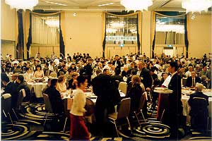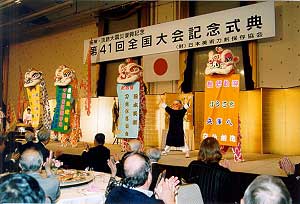After the events for the day were over on Saturday, everyone attended the banquet which was included with the attendance fee for the Taikai. The room was filled almost to capacity, and it was great being able to talk with friends about their favorites of the day. The food was fantastic and the entertainment was a great surprise- they had a local group perform a "shishi mai" or lion dance. For those of you that have ever wanted to attend such a convention, I can personally tell you any student or collector of Japanese Swords should attend at least once in your life!!!! |