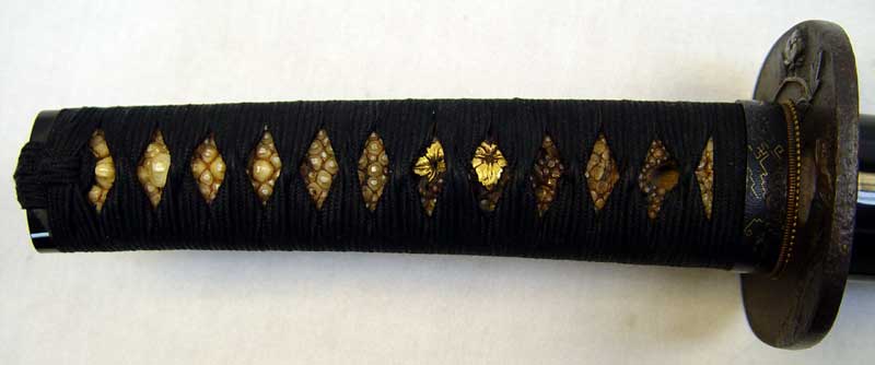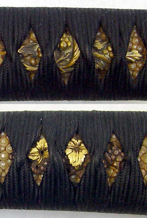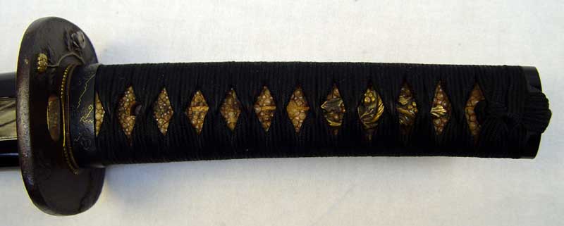 Tsuka is well wrapped with higher grade ray skin. The fuchi is shakudo