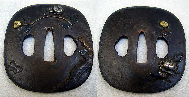 rounded square iron, with hitsu ana and a floral motif in soft metals.
