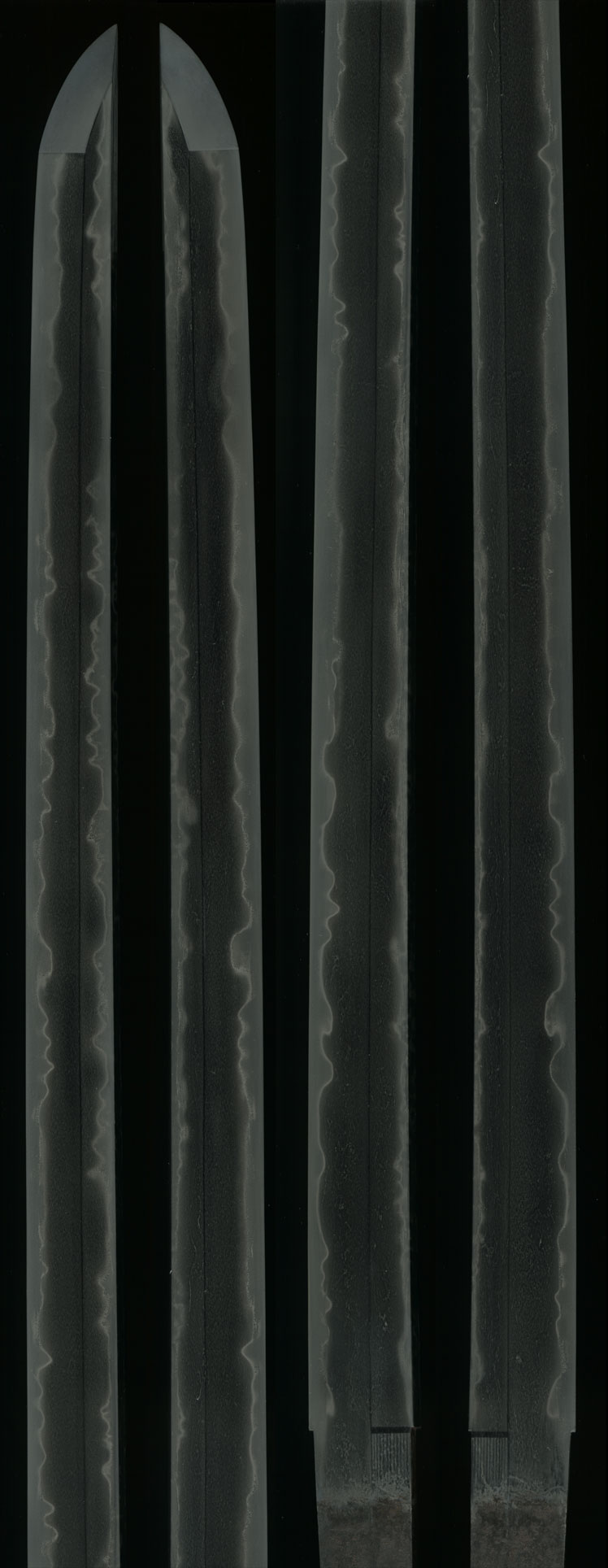 Shinto katana in full Edo-Period mount of good length measuring almost 28" was once even longer, now suriage partial-zaimei reading "Tajima Daijo Fujiwara Daido..." and cut-off. The two characters missing due to shortening should read "NAOFUSA". This strong, very healthy katana dates to the Kanei Era (ca.1624), and Naofusa was originally from Mino, where the name Daido originated from O-Kanemichi, but is said to have later resided in Tango Kuni. He was known to be a skilled carver of horimono. This blade is in good polish and exhibits the Mino tradition of the Shinto Period with a tight ko-itame hada containing ji-nie, while masame is very visible in the shinogi. The temper pattern is unusual in that not only is there hamon in the cutting edge, but there is temper running all the way back down the mune from the point. Hamon is a tight togari-style gunome midare mainly in nioi line but with larger nie crystals breaking up the tops of some gunome, and sunagashi effects. Boshi is a healthy and deep midare with nie, beautiful kissaki. Tang is 2-hole well-done suriage with partial signature remaining.