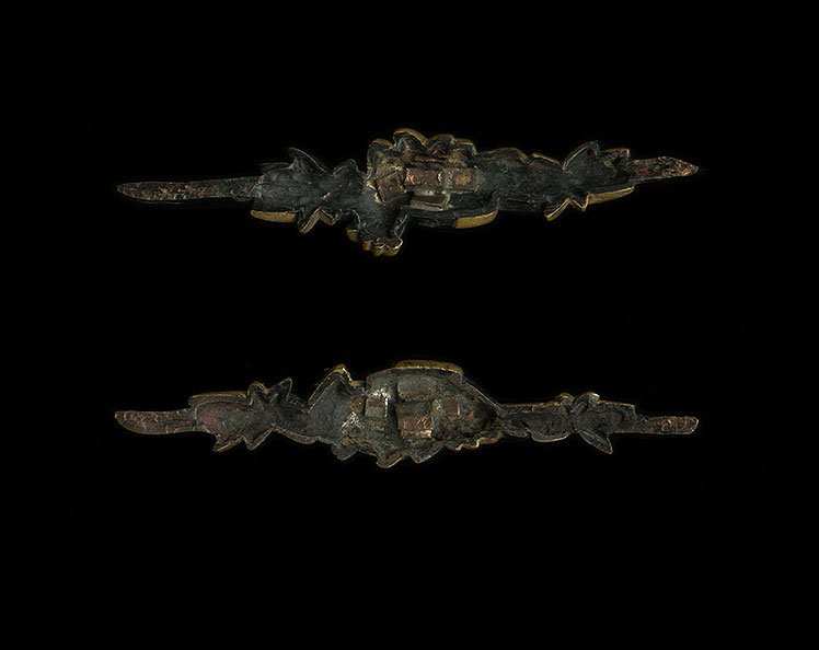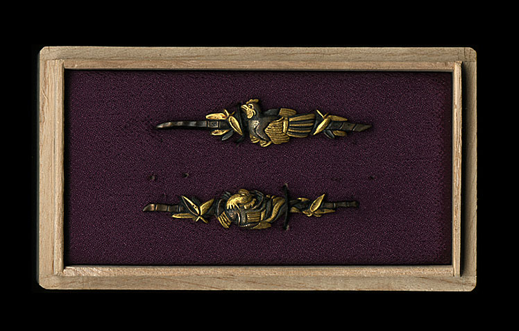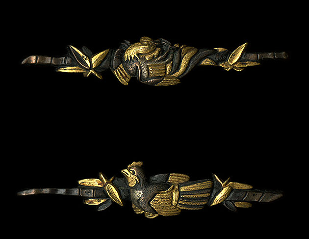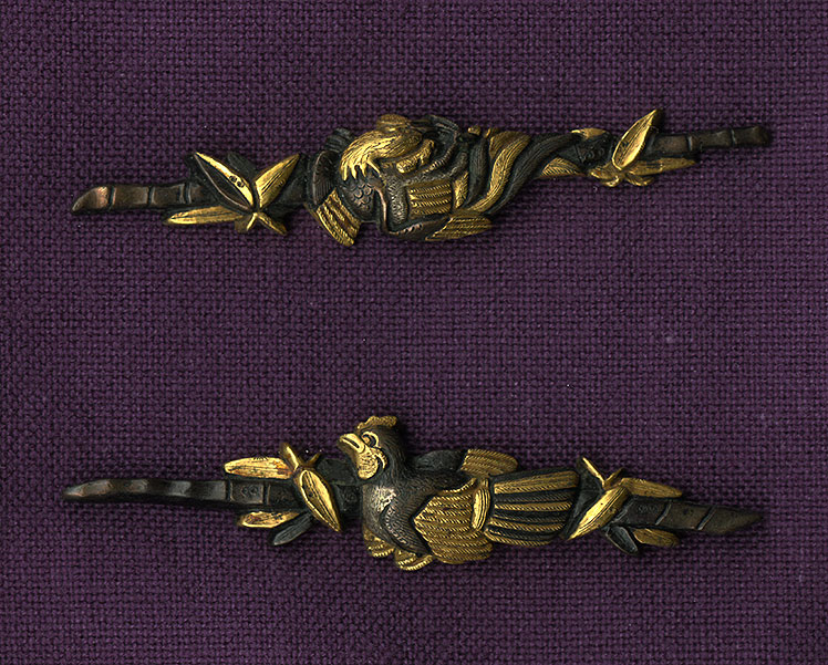 | This is a very large set of menuki with a design of a rooster and bamboo and leaves. Well made, this set which is made up of shakudo, and gold. They are very well carved, just look at the detail of the carving on the rooster, it is very well done. |  |