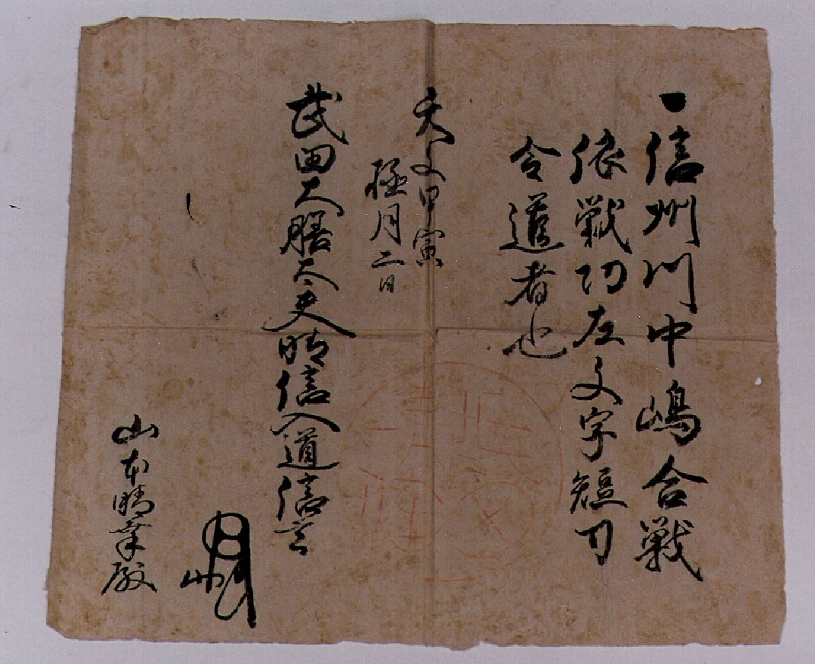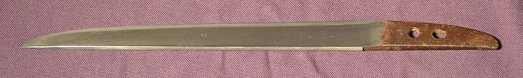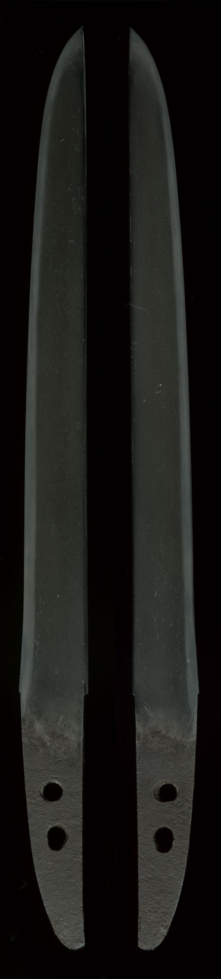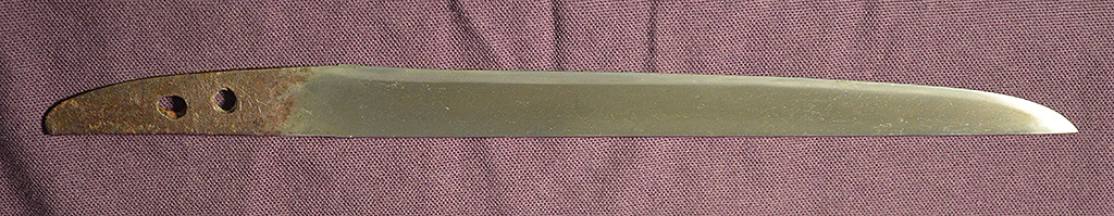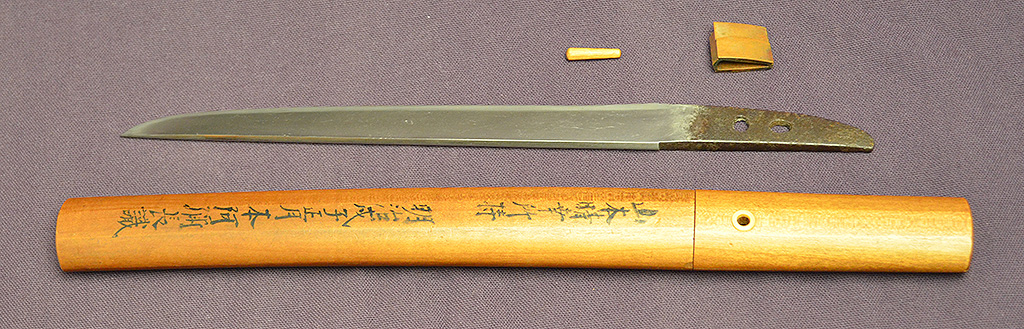 Tanto attributed to Sa of the Chilkuzen School. This tanto of hirazukuri form, is in old polish. Though difficult to see due to an old polish, the hamon consists of a shallow sugu-notare. Small kinsuji appears within the hamon. On one side, the hamon appears to have "shimi" from about 1.5 cm above the hamachi on the omote side.The ji is a itame with a type of utsuri ( hard to tell due to the old polish). Boshi is a maru, almost an o maru shape. Mune is mitsumune. There are some very small openings in the ji and ha, but otherwise in decent shape. The tang shows age, and there seems to be a signature that looks like "Sa" above the mekugi ana. According to the shirasaya, this blade is by Samonji, who was one of Masamunes 10 students. The attribution is by Honnami Choshiki, but we have to question as to the validity of this sayagaki. This tanto is accompanied by a old paper that states that this tanto was either the property of the famous samurai Yamamoto Kansuke or Takeda Harunobu. This has NOT been verified.